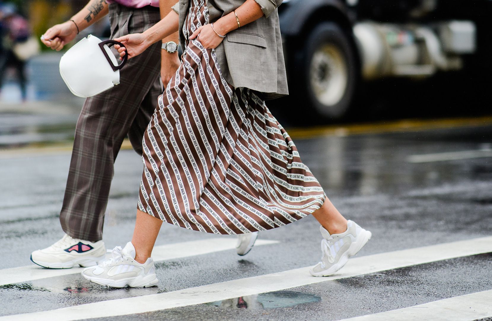 Todas aquelas peças tradicionais do office look (como por exemplo saias e vestidos mídi, camisas, calças com corte de alfaiataria) ficam incrível em um look com tênis. Aliás, o mix de peças mídi e fluídas com um tênis despojado é um truque de styling incrível para equilibrar a feminilidade. No caso das mulheres com estilo romântico, essa mistura ajuda a deixar o total look menos delicado.